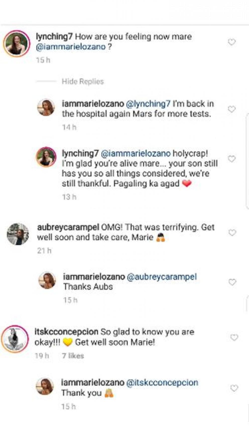 Unang Hirit host Lyn Ching and Kapuso showbiz reporter Aubrey Carampel reacted to the Instagram post of Marie Lozano and are glad that Marie is doing fine.