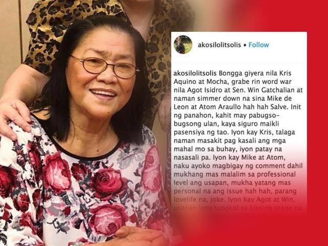 Hindi naiwasang magkomento ng batikang showbiz writer na si Lolit Solis sa kasalukuyang political at social issues sa bansa tulad ng alitan nina Queen of All Media Kris Aquino at Presidential Communications Assistant Secretary Margaux "Mocha" Uson.