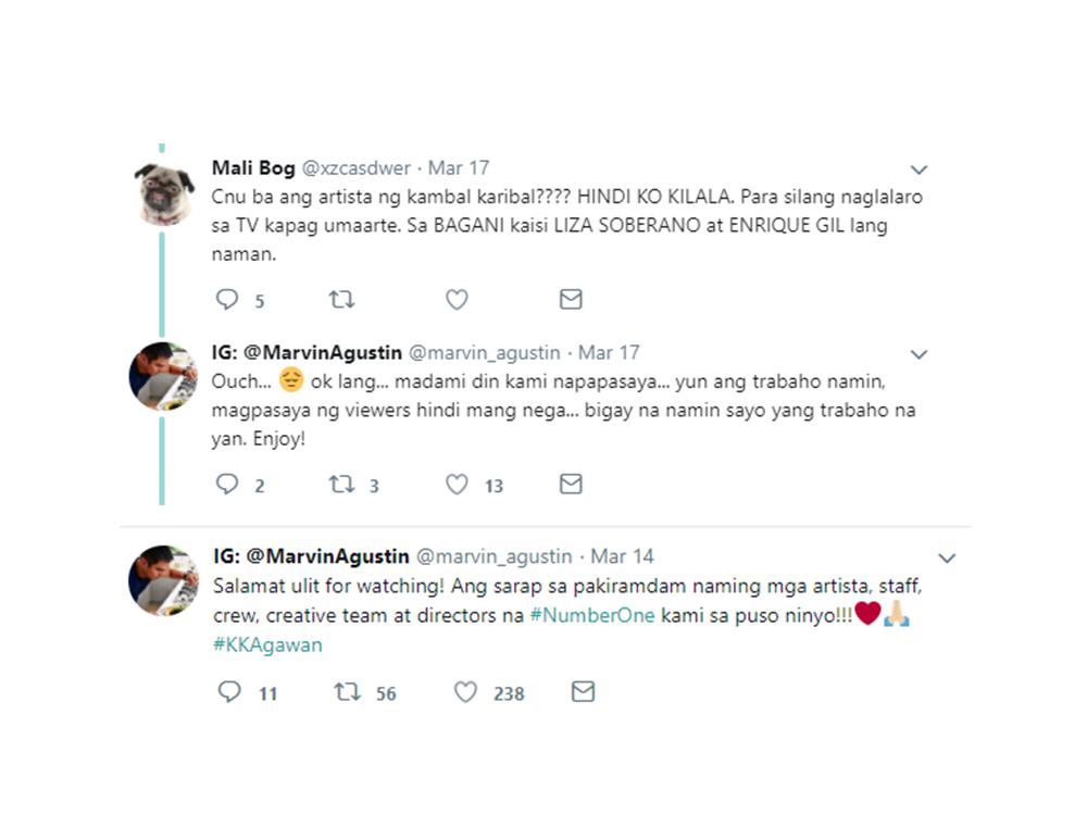 Kasabay ng pamamayagpag ng Kambal, Karibal, isang netizen ang nag-post ng pangmamaliit sa show kung saan kabilang si Marvin Agustin. Tila hindi nagustuhan ng beteranong aktor ang pamba-bash ng isang netizen patungkol sa show.