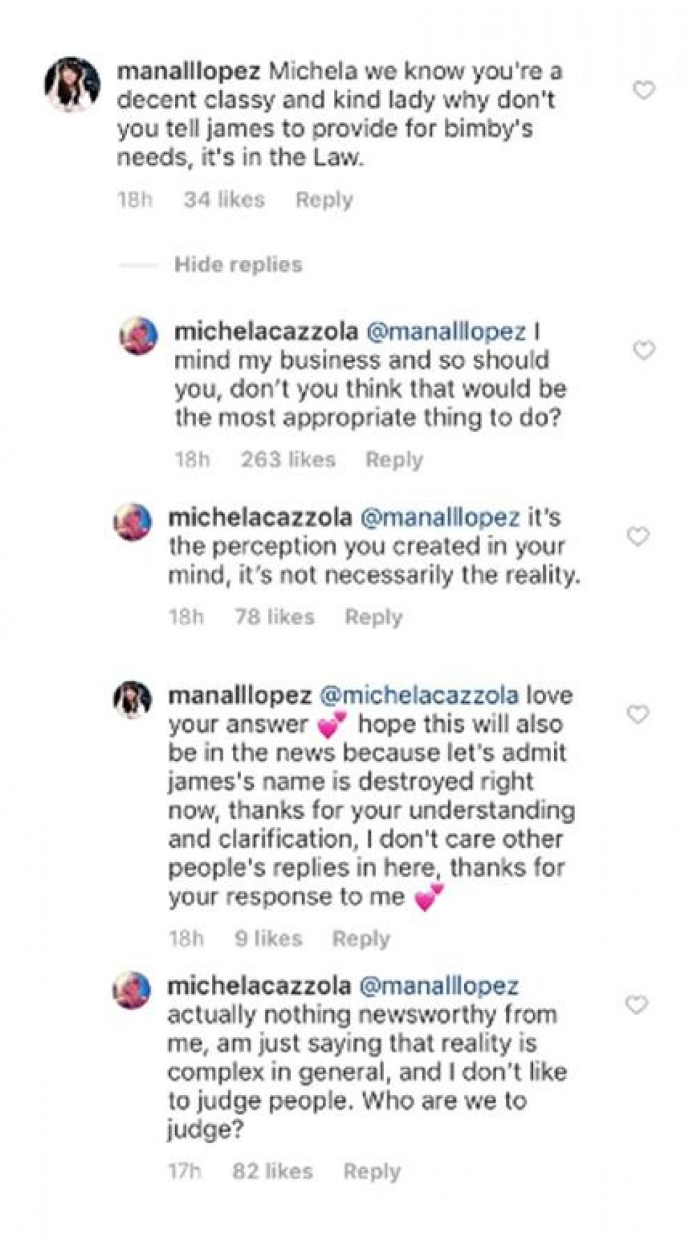 Ngayon, nadamay na din ang girlfriend ni James na si Michela Cazzola. Nag-react kasi ito sa komento ng isang netizen patungkol sa sustento na dapat ibigay ng kaniyang boyfriend sa anak niya na si Bimby.