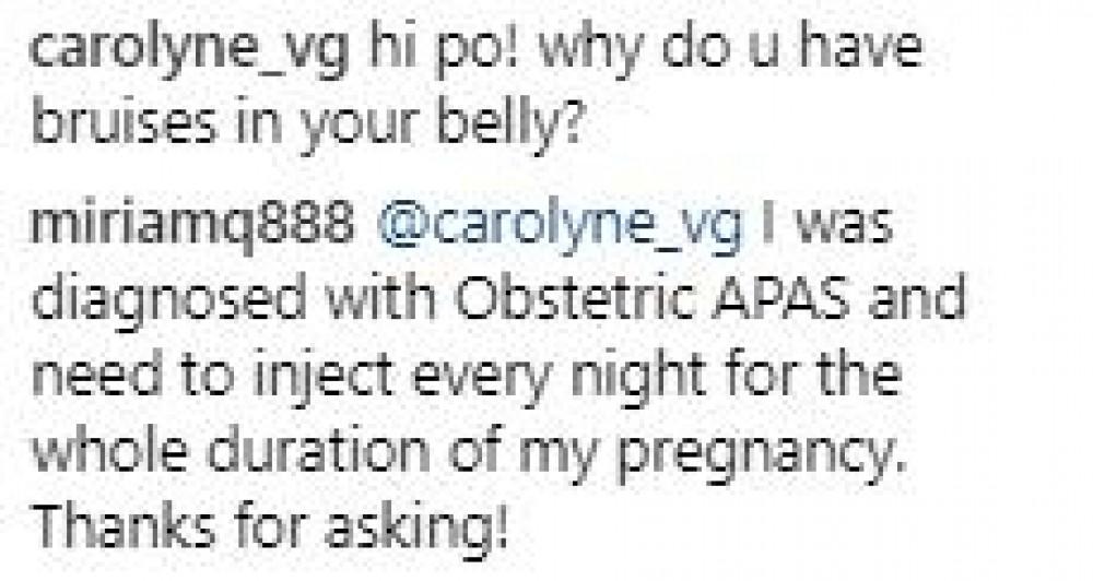 A concerned netizen couldn't help but notice Miriam's bruises on her belly, Miriam replied to the netizen's comment explaining her condition.