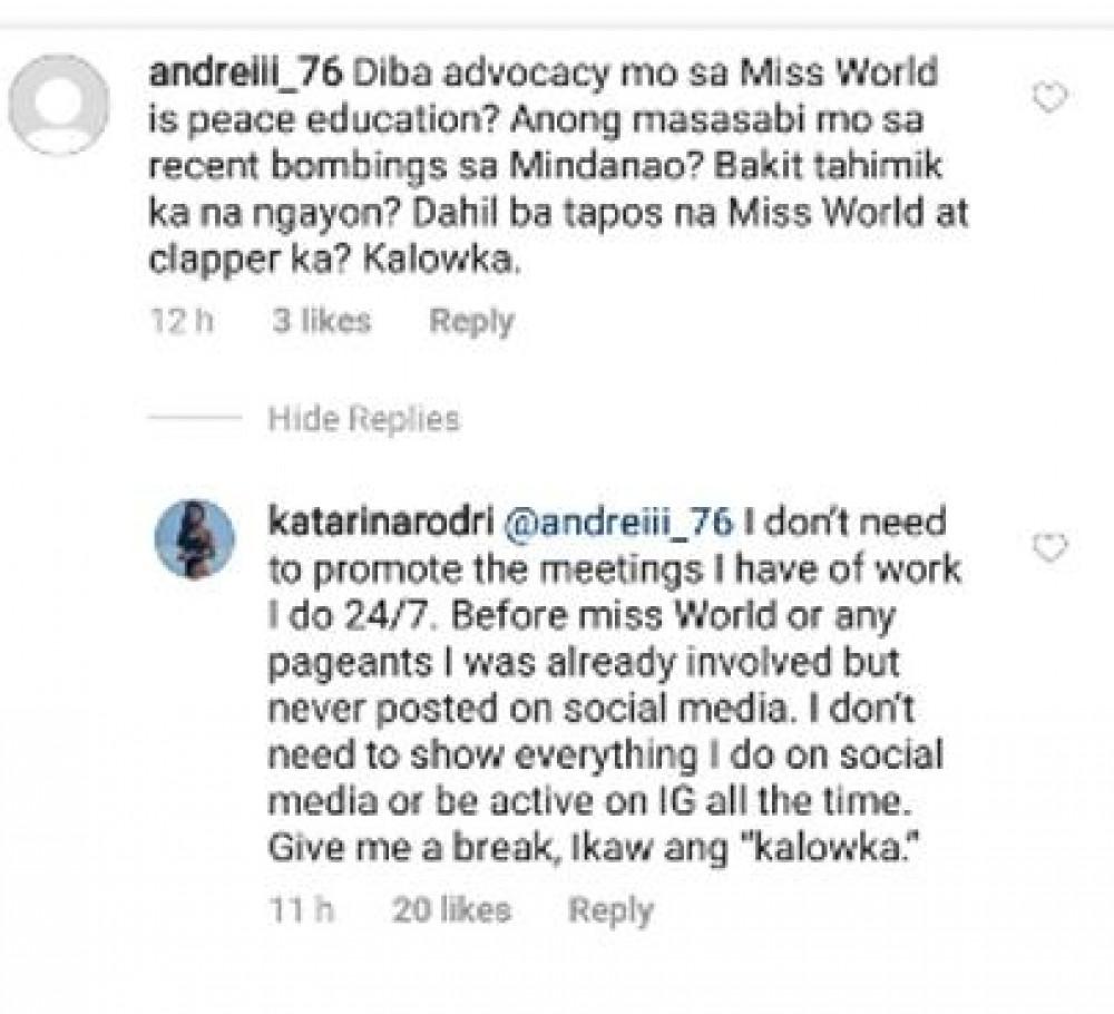 Netizen @andreii_76 commented on Katarina's Instagram page and wrote, “Diba advocacy mo sa Miss World is peace education? Anong masasabi mo sa recent bombings sa Mindanao? Bakit tahimik ka na ngayon? Dahil ba tapos na Miss World at clapper ka? Kalowka?”