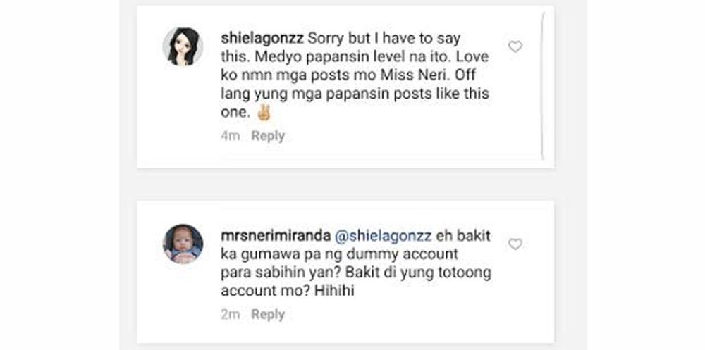 Pero isang basher ang nag-comment sa video at sinabi nito na ‘tila nagpapansin si Neri. Agad naman sumagot ang misis ni Chito at hinamon niya ang netizen na gamitin ang totoo niyang Instagram account at huwag magtago sa isang dummy account.