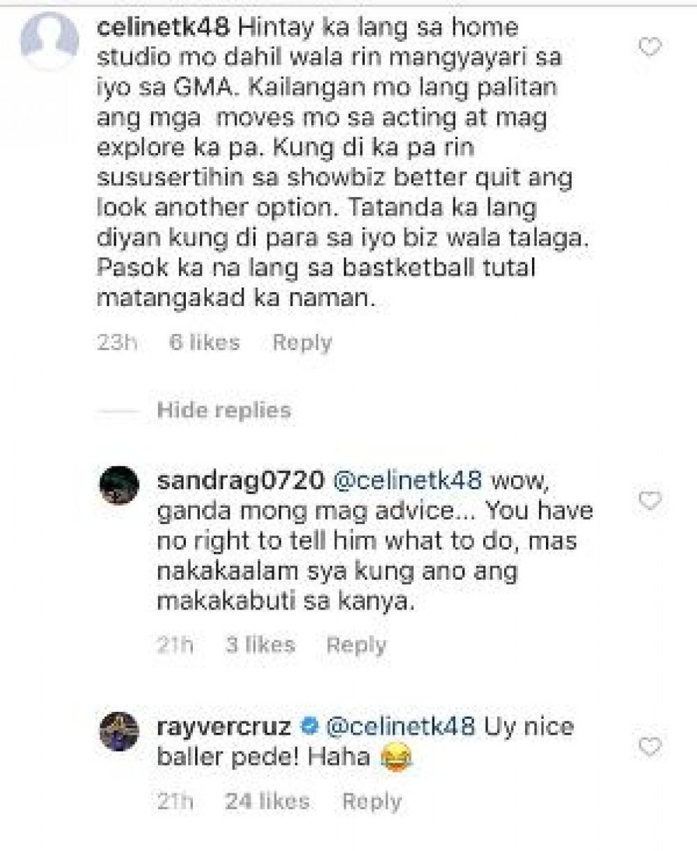 Ayon sa netizen, na may Instagram handler na @celinetk48, “Hintay ka lang sa home studio mo dahil wala rin mangyayari sa iyo sa GMA. Kailangan mo lang palitan ang mga moves mo sa acting at mag explore ka pa.”