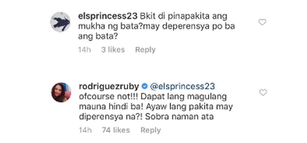 Nagtanong ang netizen na si @elsprincess23 kung bakit hindi ipinakita ni Ruby ang mukha nang baby at may sundot pa itong tanong kung may deperensya ba ang bata.