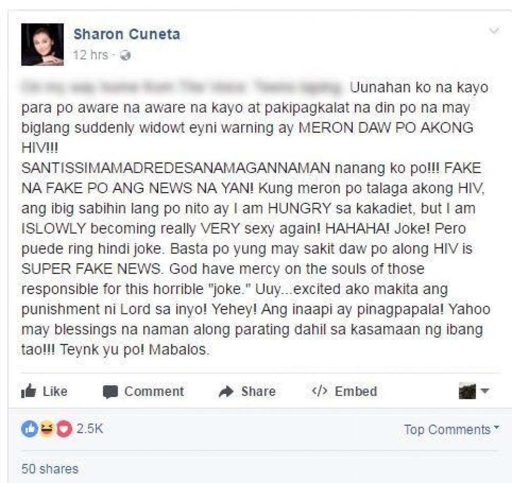 Megastar Sharon Cuneta immediately took to Facebook to correct the wrong information spreading on social media saying she has HIV or human immunodeficiency virus.