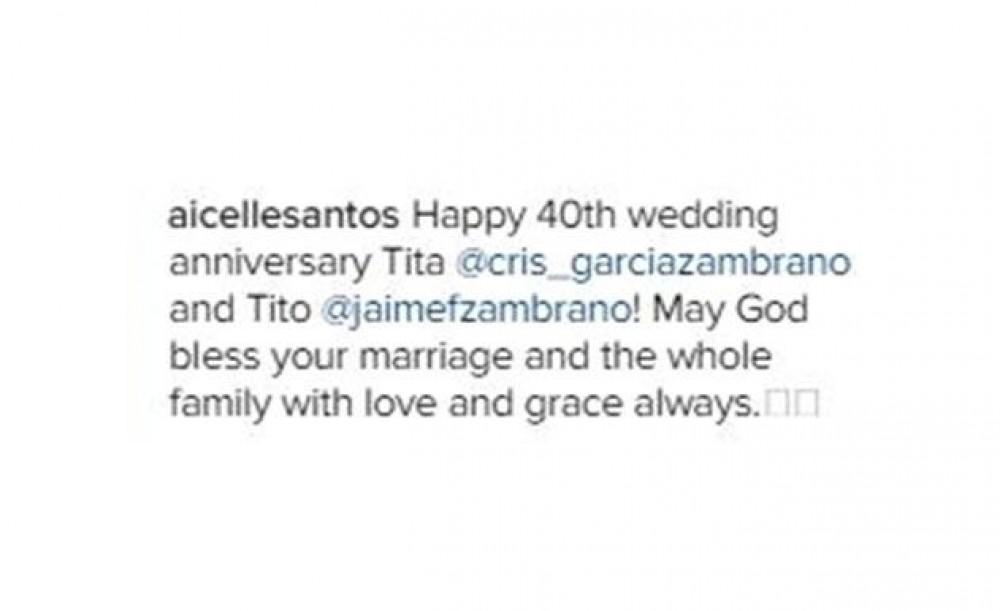 Aicelle posted, “Happy 40th wedding anniversary Tita @cris_garciazambrano and Tito @jaimefzambrano! May God bless your marriage and the whole family with love and grace always.????”