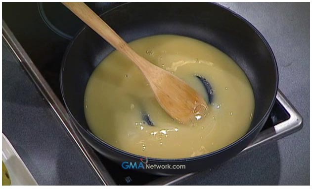 3. In a saucepan, heat condensed milk until golden brown or caramelized. Add water to adjust thickness, let it cool.