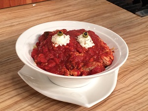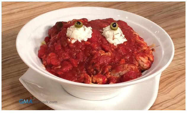 4. Place pasta in platter and top with brain sauce. Scoop the egg white into balls and put on top of the brain sauce. Decorate with egg and slices of green and black olives. Sprinkle saffron on the side of egg balls.