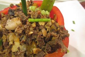 8. Simmer for 2 minutes then place in big bell peppers and garnish with green chili pepper. Serve with hot rice.