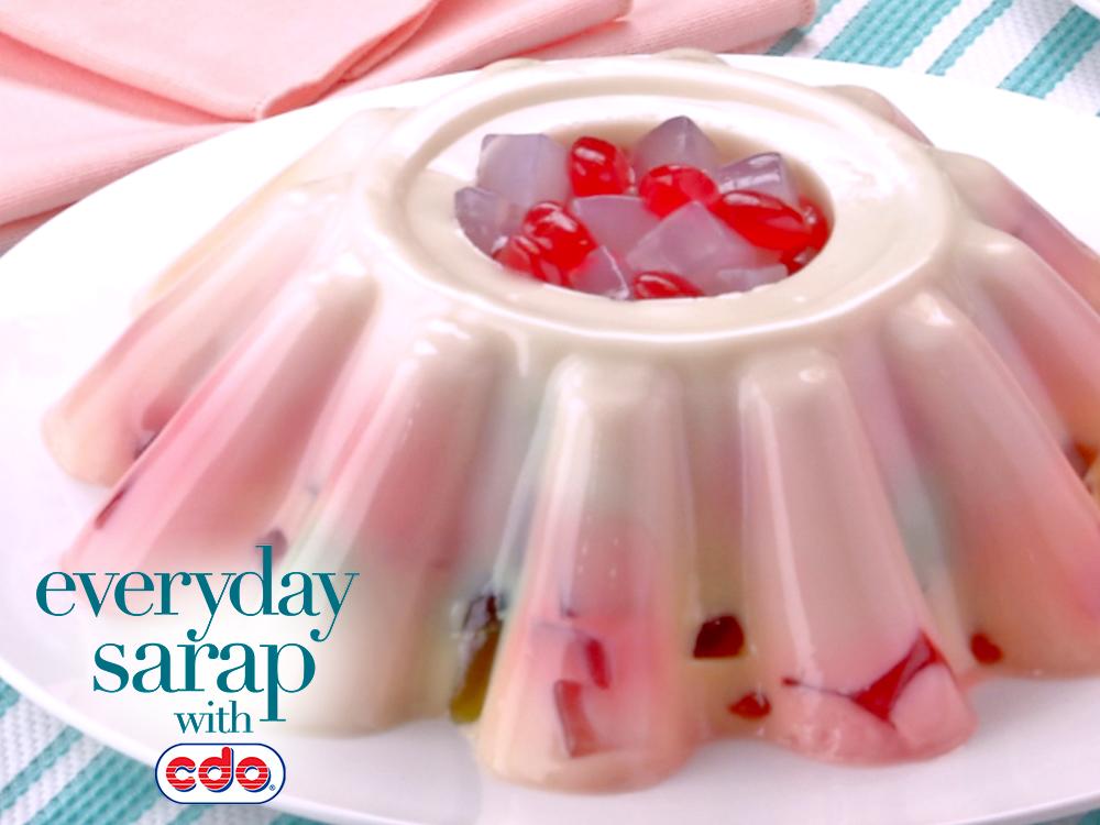 8. Pour the gelatin mixture into the milk mixture, whisking until well incorporated. Pour this gelatin-milk mixture evenly over the jelly cubes in the mold together with CDO Nata de Coco. Allow to set in the fridge for at least 4 hours or overnight.