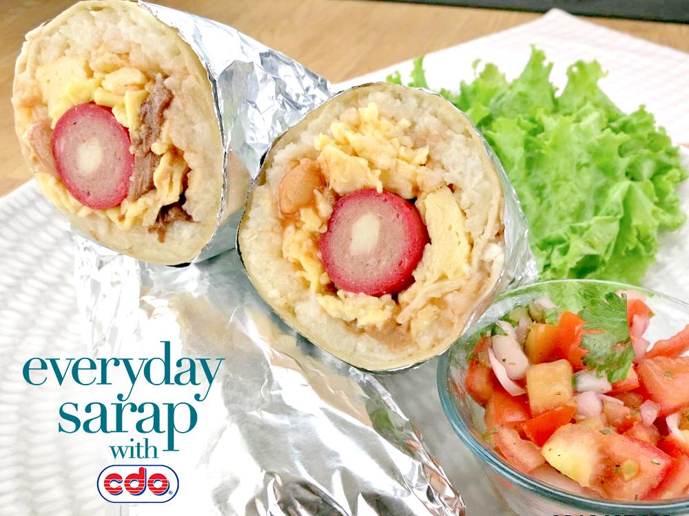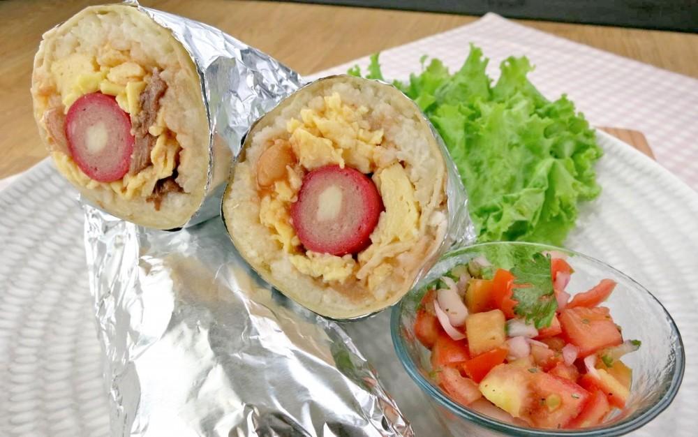 5. Spoon some scrambled eggs and pork and beans then sprinkle with some grated cheese before rolling and wrapping it in foil.