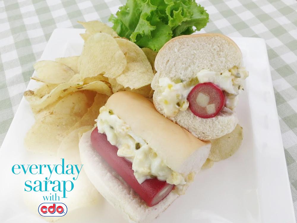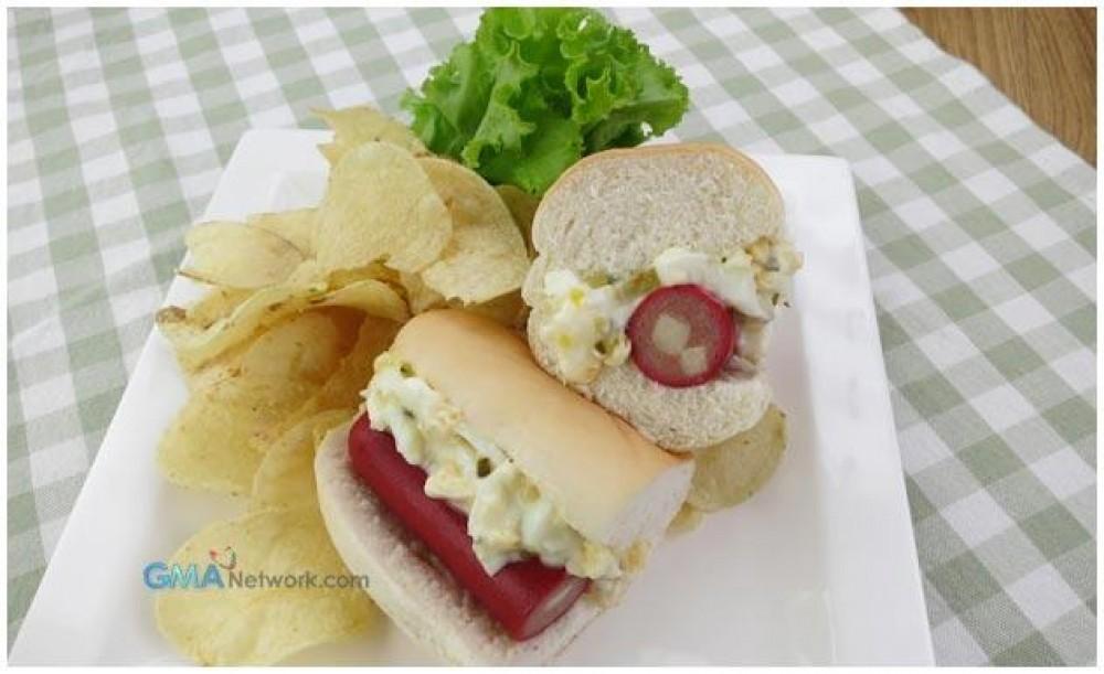 4. Place the hotdogs in the toasted buns then top with the egg salad filling.