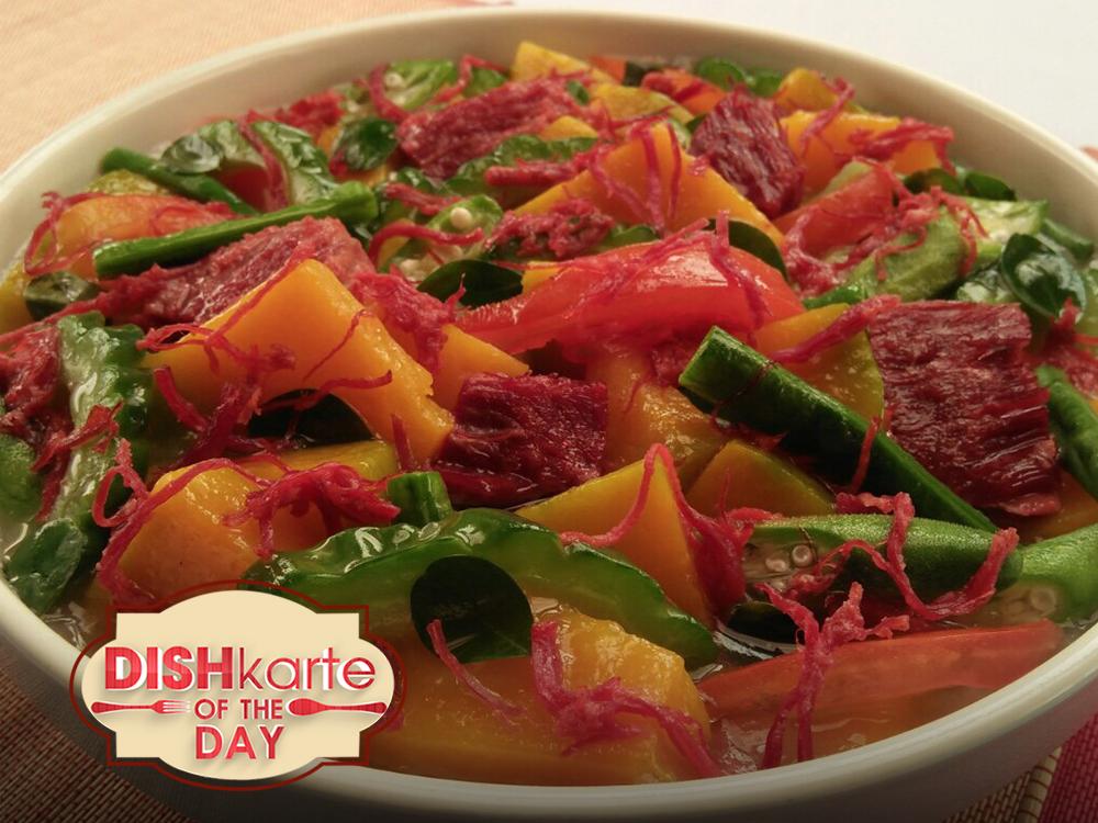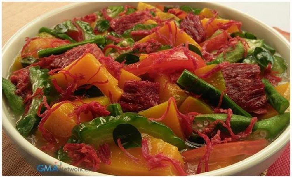 2. Add onion, tomato, string beans, okra, squash, and ampalaya.
