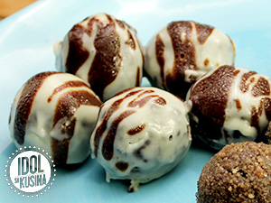 7. When chocolate and cream cookie balls have set, drizzle melted chocolate and white chocolate on top of each chocolate and cream cookie balls.