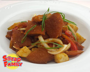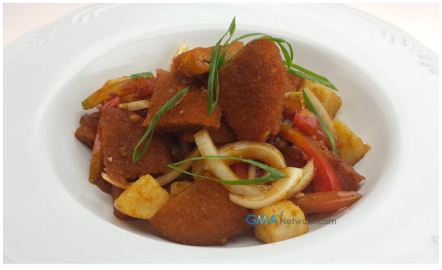 In a pan, fry CDO Ulam Burger crispy patties until browned, cut into cubes then set aside.