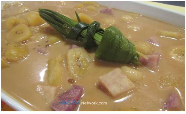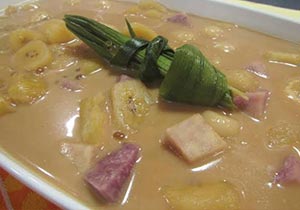 Place the coconut milk in a casserole and bring to a boil. Add the sago, sweet potato, taro and other root crops you may have. Cook for 5 minutes, then add the banana, jackfruit and rice balls. Continue to cook over moderate heat until all the rice balls float to the surface.