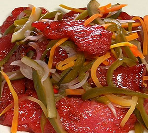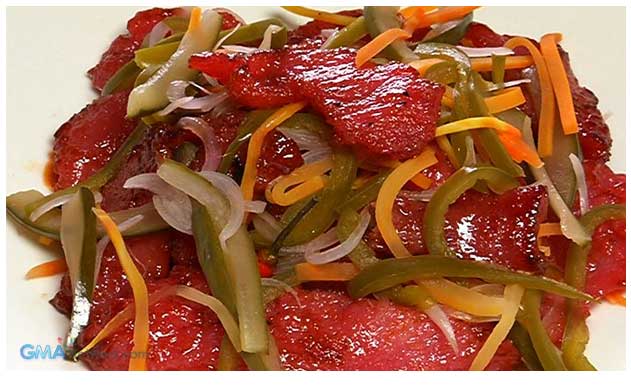 Heat grill pan, then pan grill CDO Young Pork Tocino. Place in a bowl then toss in pickled vegetables.
