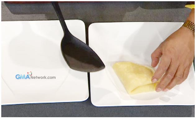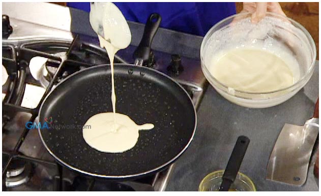 2. In a non-stick pan, heat and put a little butter. Pour one ladle of batter. Cook and flip on the other side. Repeat with the rest of the batter. Set aside.