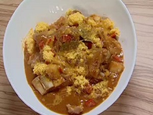 4. Add pineapple juice, 6-8 cups of water, ground peppercorns and bay leaf. Bring to a boil and simmer for 30-45 minutes or until pork is tender. Add more water as necessary.