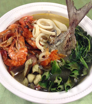 Reduce the heat and slowly add in the fish for a few minutes and add the shrimp, squid and kangkong leaves.