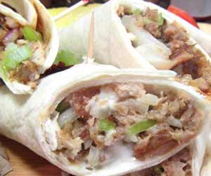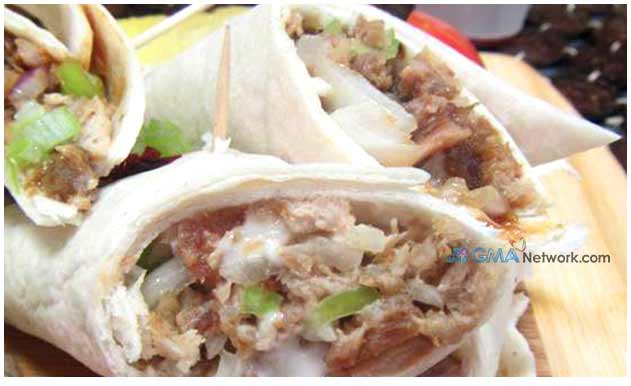 Lay one flour tortilla on a plate and place the sisig mixture and leeks on one end. Roll to form a wrap and slice each roll in half for plating and dip with hoisin sauce.