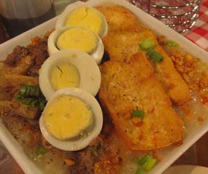 Taste and season with fish sauce, ground pepper, and salt. Garnish with eggs, spring onion, leeks, toasted garlic