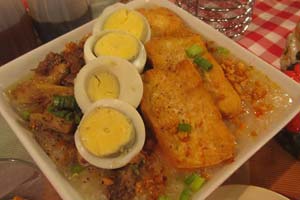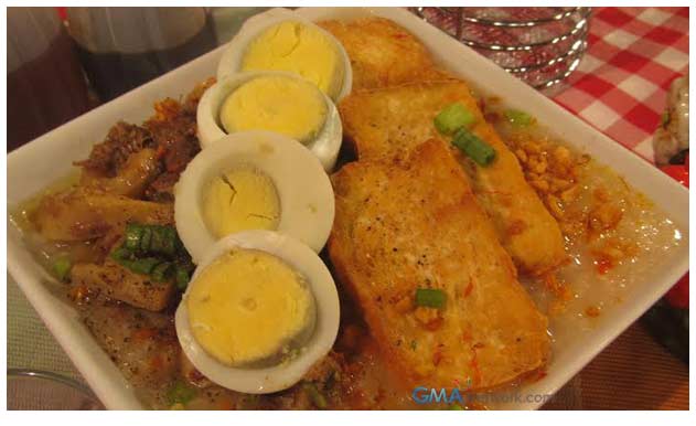 Transfer to serving bowl then add hard-boiled eggs and beef. Sprinkle with safflower, toasted garlic and spring onions then serve with calamansi.