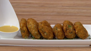 2. Deep- fry until golden brown, place on the plate and serve with honey mayo, mustard sauce.