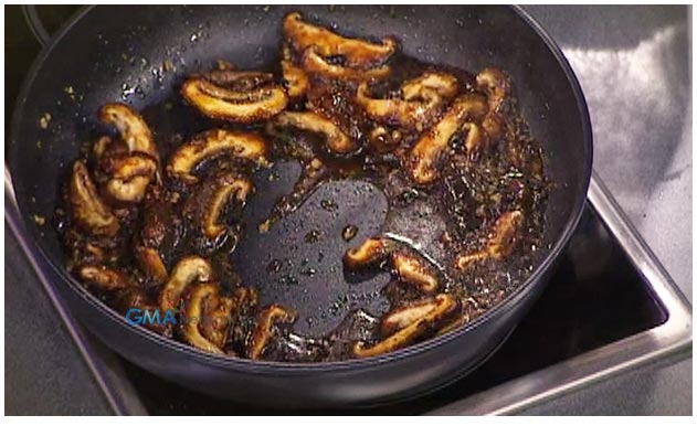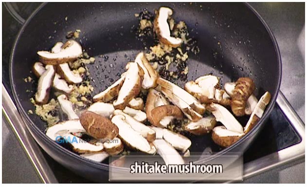 3. In a wok, heat oil and add sesame oil. Sauté ginger, garlic and black beans. Add spring onions and shiitake mushrooms. Sauté.