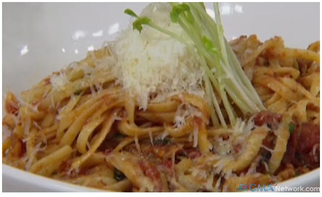 1. Sauté garlic,onion,tomato,in olive oil ,TUYO,then LINGUINNI pasta   Pour white wine,toss nicely add basil and Parmesan cheese.sprinkle on top with chili flakes.