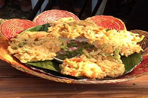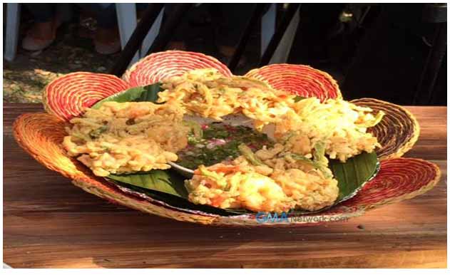 1. Combine in mixing bowl, ubod, flour, peanuts, shrimp, annato powder, spring onions, cornstarch, green and red bell peppers. Season with salt and pepper and shape into patties. Set aside.