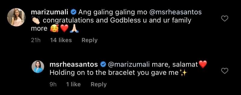 Unang Hirit host Mariz Umali commented: "Ang galing galing mo. Congratulations and God bless you and your family more."