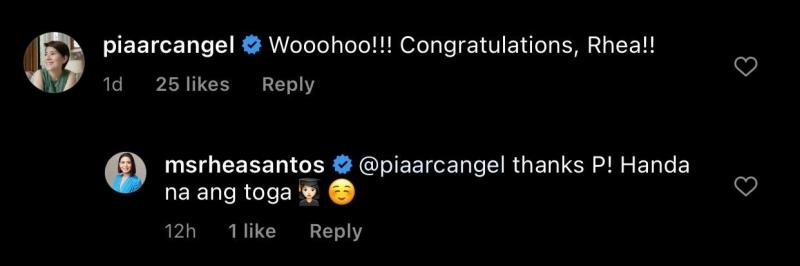 Also spotted in the comments section is news anchor Pia Arcangel who wrote: "Wooohoo!!! Congratulations, Rhea!!"