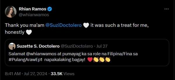 Sagot ni Rhian, “Thank you ma'am @SuziDoctolero. it was such a treat for me, honestly”