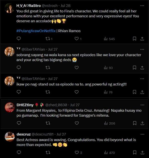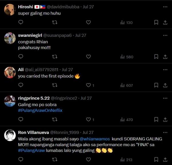 Ilang netizens pa ang nagpahayag ng kanilang paghanga sa pag-arte ni Rhian sa first episode ng Pulang Araw. Isang netizen pa ang umamin na napanganga siya sa naging performance niya bilang si Fina.