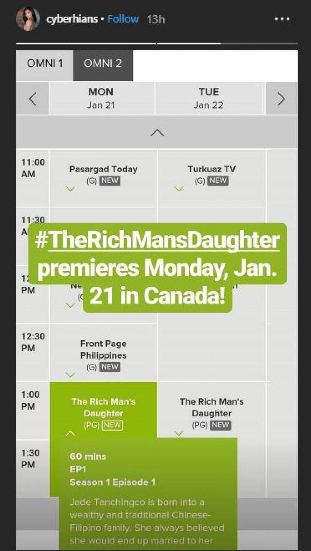 Kasunod nito, ni-repost din ni Rhian ang schedule ng pagpapalabas ng kontrobersiyal na teleserye nila ni Glaiza de Castro, ang The Rich Man's Daughter, sa Canada.