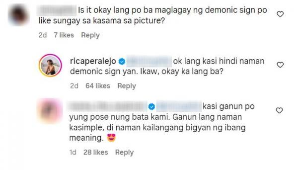 Marami ang napakamot ng ulo sa komento ng isang netizen na gumawa raw ng “demonic sign” si Rica Peralejo sa video na i-pinost niya sa Instagram.