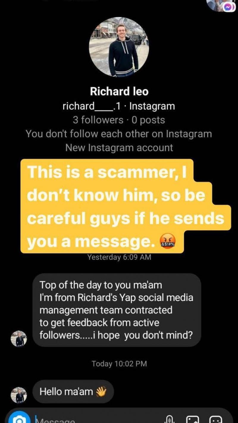 The message read, "Top of the day to you ma'am. I'm from Richard's Yap social media management team contracted to get feedback from active followers....i hope you don't mind?"