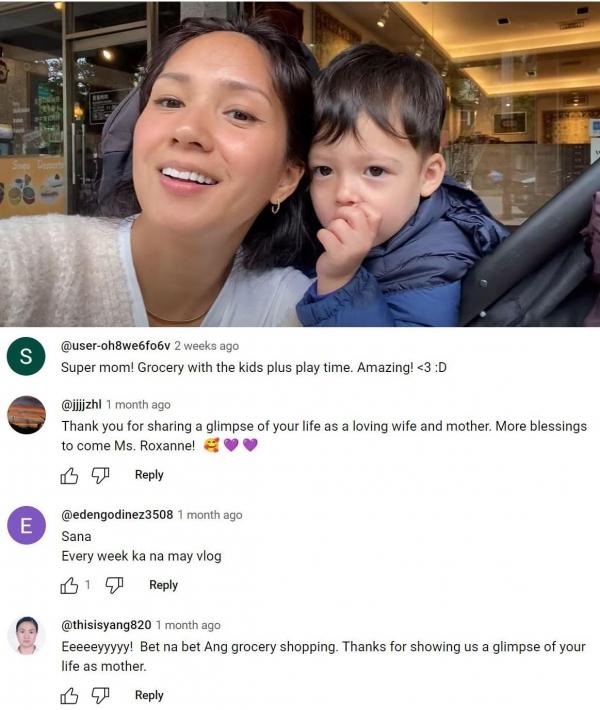 Kasama ni Roxanne sa kaniyang pag-grocery sina Cinco at Theo. Ipinakita pa niya kung paano maging productive ang kaniyang araw habang ipinapasyal ang mga anak. Dahil dito, umani ng papuri ang dating aktres mula sa mga sumusubaybay sa kaniyang vlog.