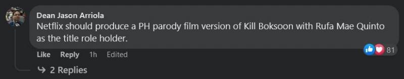 “Netflix should produce a PH parody film version of Kill Boksoon with Rufa Mae Quinto as the title role holder,” one netizen said.