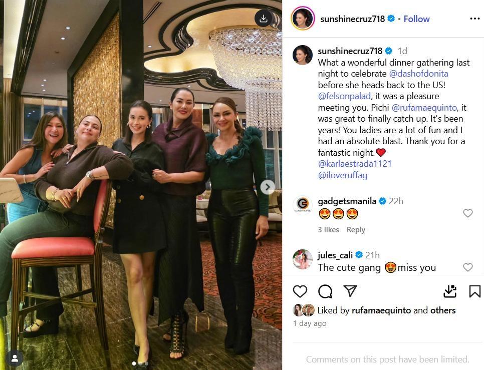 The Beauty Empire star reconnected with fellow actresses Sunshine Cruz, Rufa Mae Quinto, Donita Rose, and Karla Estrada as they bonded over good food and shared stories from their time in the industry, as seen on her Instagram post on Tuesday, September 30.