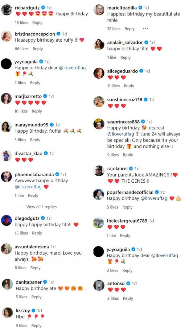Businesswoman Alice Eduardo, the eldest sister of socialite-vlogger Small Laude commented on Ruffa's post to greet her a happy birthday.