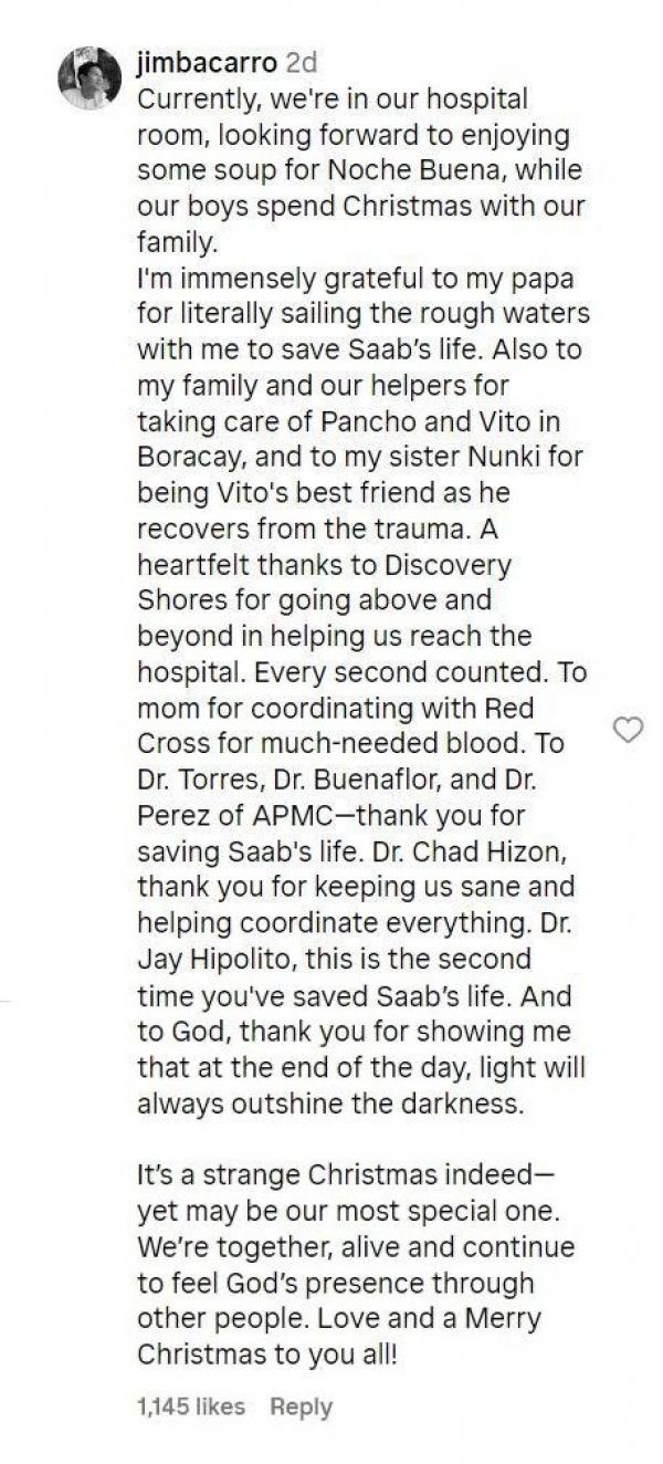 “I'm immensely grateful to my papa for literally sailing the rough waters with me to save Saab's life. Also to my family and our helpers for taking care of Pancho and Vito in Boracay, and to my sister Nunki for being Vito's best friend as he recovers from the trauma.