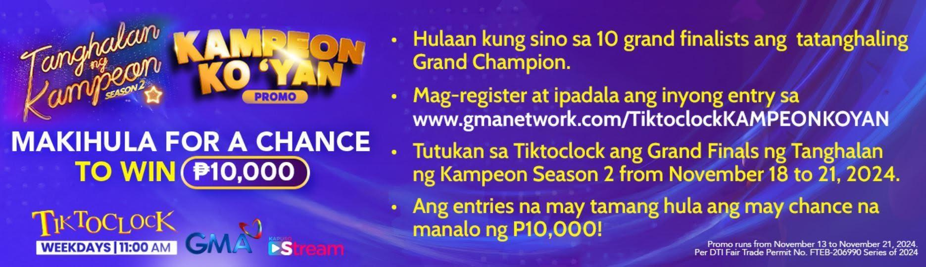 Para sa kabuuang detalye, bumisita sa www.gmanetwork.com/TiktoclockKAMPEONKOYAN at tumutok sa TiktoClock sa November 18 hanggang 21.