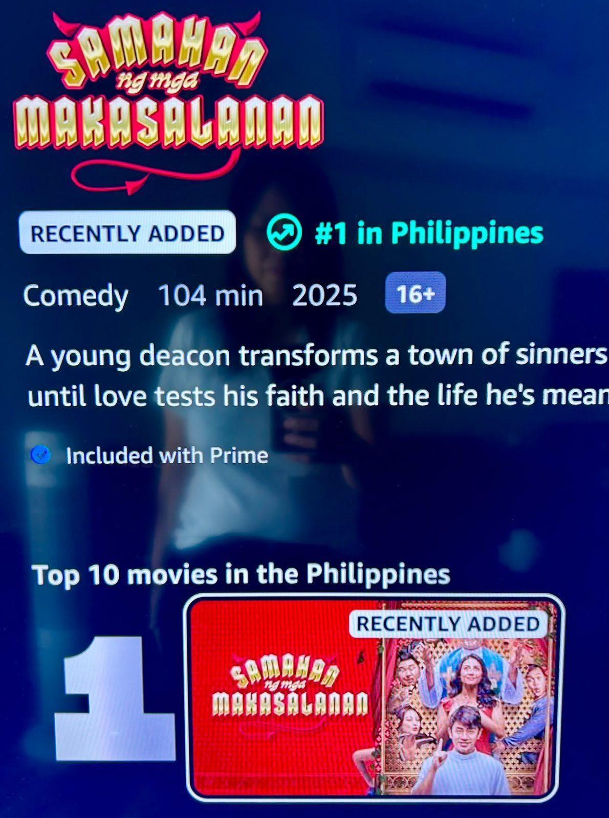 Blending comedy with themes of faith and second chances, Samahan ng Makasalanan continues to gain traction among audiences, now topping streaming charts on Prime Video.