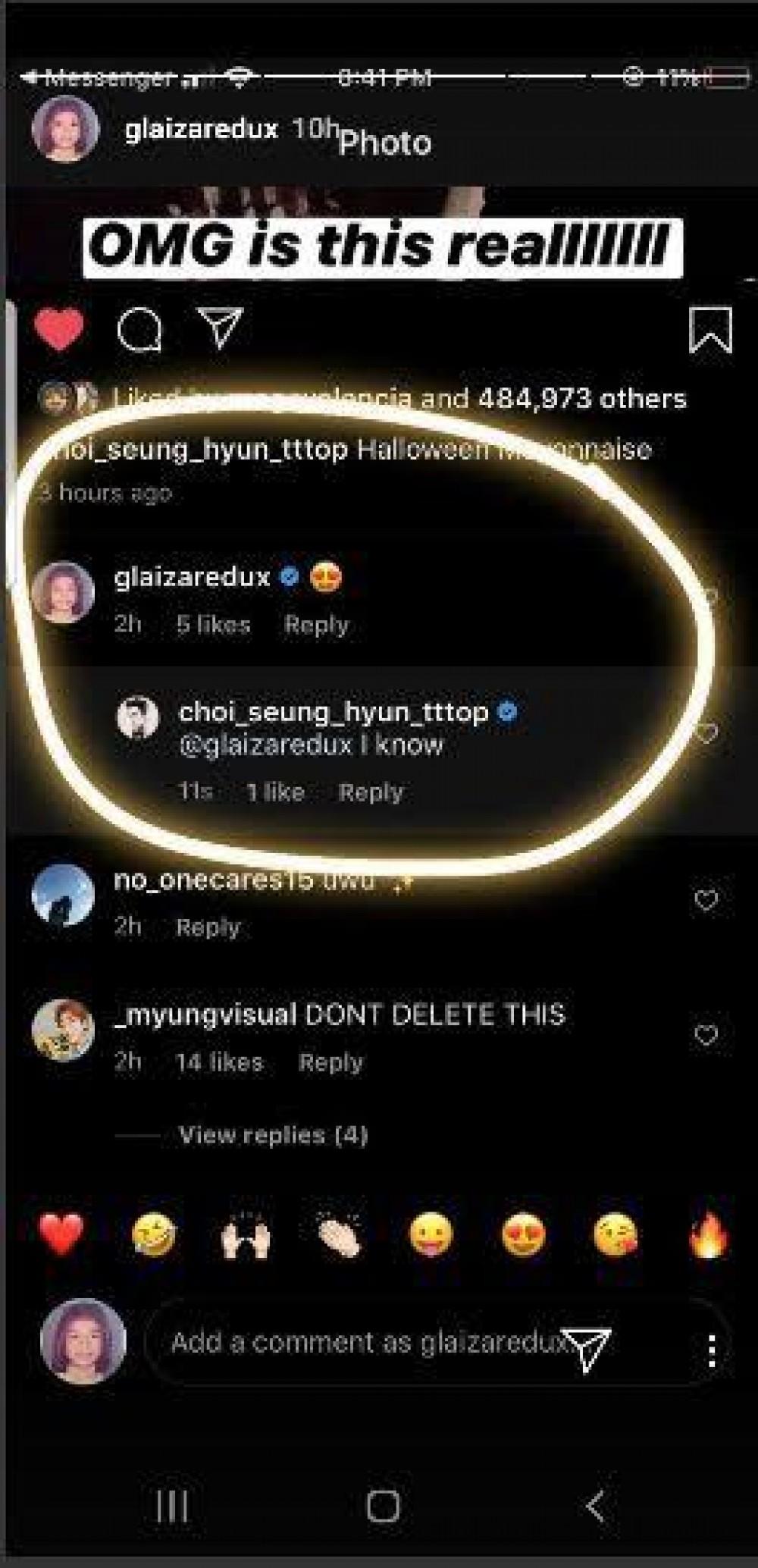 Sa Instagram Story ni Glaiza, ibinahagi niya ang screenshot ng reaction ni T.O.P nang mag-comment siya sa Instagram post nito kahapon, October 31.