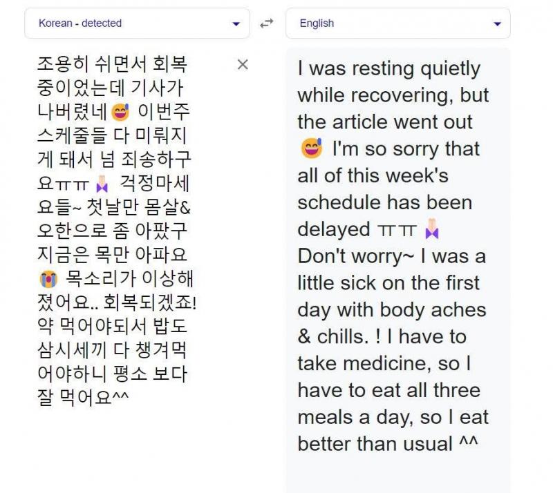 “I was resting quietly while recovering, but the article went out. I'm so sorry that all of this week's schedule has been delayed. Don't worry, I was a little sick on the first day with body aches & chills. I have to take medicine, so I have to eat all three meals a day, so I eat better than usual.