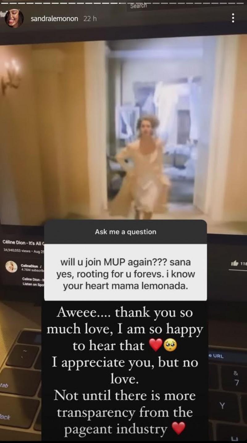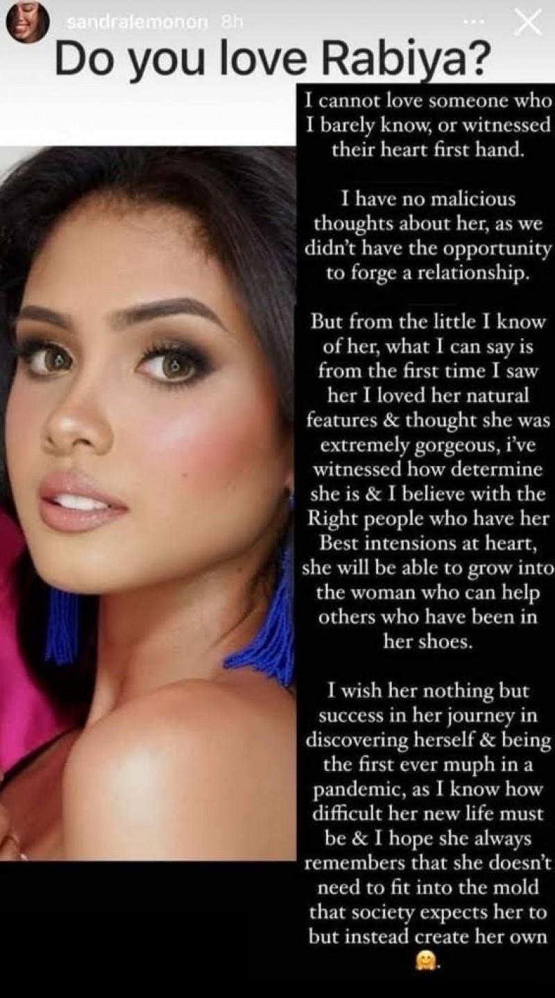 Candidate Sandra Lemonon has finally revealed what she thinks of Miss Universe Philippines 2020 winner Rabiya Mateo.