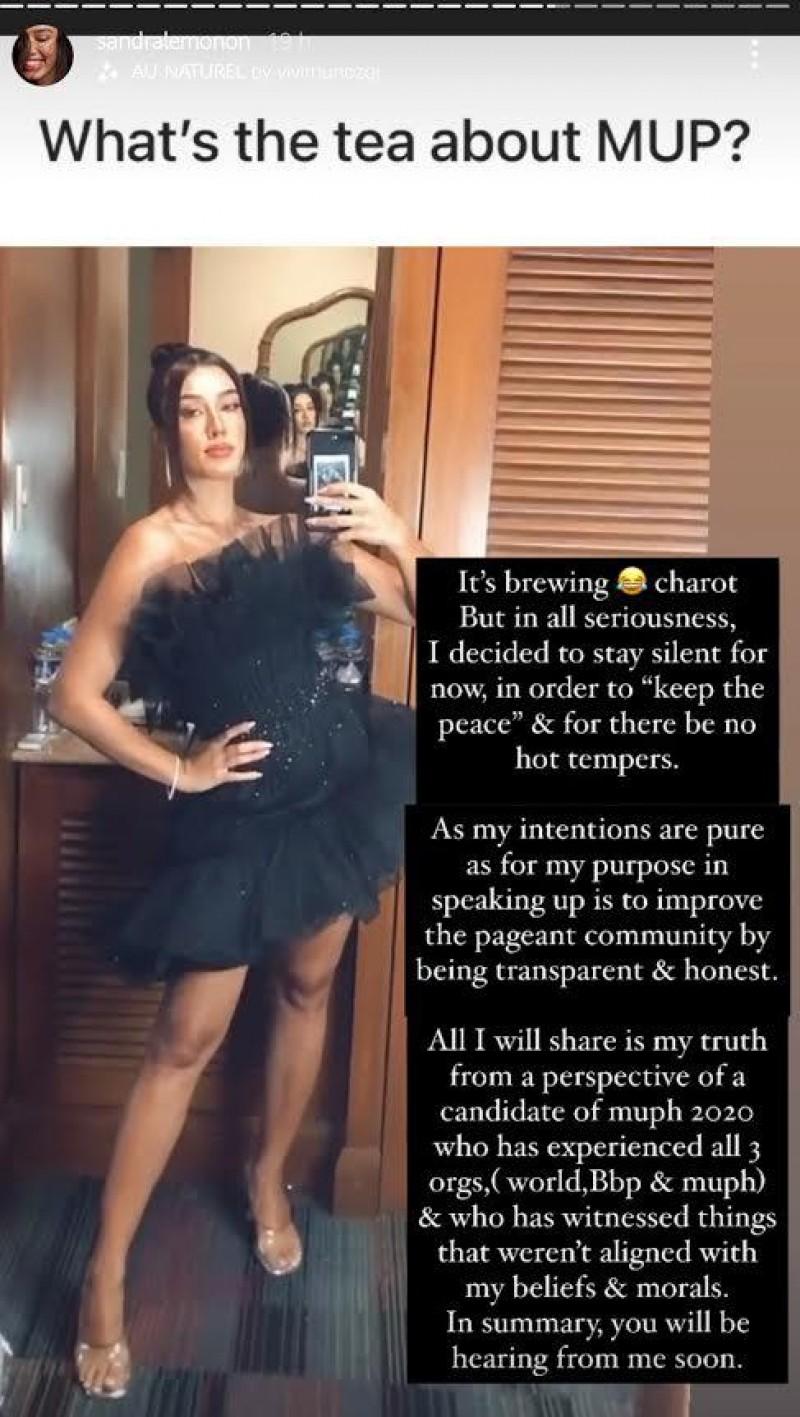Two months since Miss Iloilo City Rabiya Mateo grabbed the crown as Miss Universe Philippines 2020, candidate Sandra Lemonon said she would be spilling the tea about the pageant "soon."